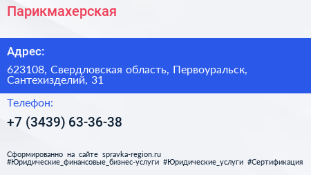 Парикмахерская по адресу 623108, Свердловская область, Первоуральск, Сантехизделий, 31 в дальнейшем Организация, размещена в следующих категориях: