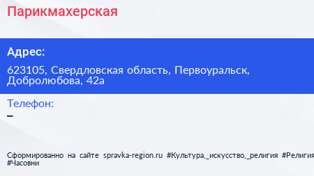 Парикмахерская по адресу 623105, Свердловская область, Первоуральск, Добролюбова, 42а в дальнейшем Организация, размещена в следующих категориях: