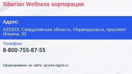 Siberian Wellness, корпорация по адресу 623103, Свердловская область, Первоуральск, проспект Ильича, 31 в дальнейшем Организация, размещена в следующих категориях: