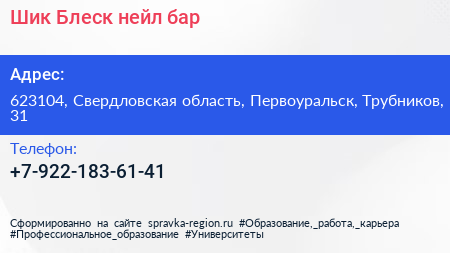 Шик & Блеск, нейл-бар по адресу 623104, Свердловская область, Первоуральск, Трубников, 31 в дальнейшем Организация, размещена в следующих категориях:
