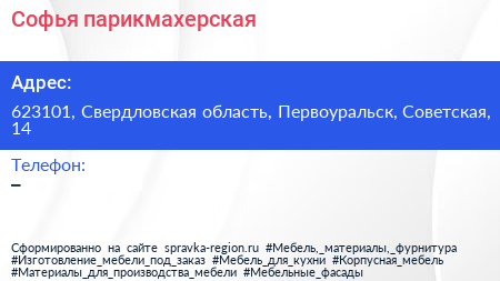 Софья, парикмахерская по адресу 623101, Свердловская область, Первоуральск, Советская, 14 в дальнейшем Организация, размещена в следующих категориях: