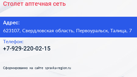 Столет, аптечная сеть по адресу 623107, Свердловская область, Первоуральск, Талица, 7 в дальнейшем Организация, размещена в следующих категориях: