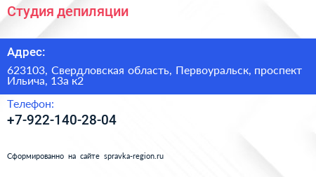 Студия депиляции по адресу 623103, Свердловская область, Первоуральск, проспект Ильича, 13а к2 в дальнейшем Организация, размещена в следующих категориях: