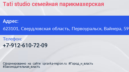 Tati studio, семейная парикмахерская по адресу 623101, Свердловская область, Первоуральск, Вайнера, 59 в дальнейшем Организация, размещена в следующих категориях: