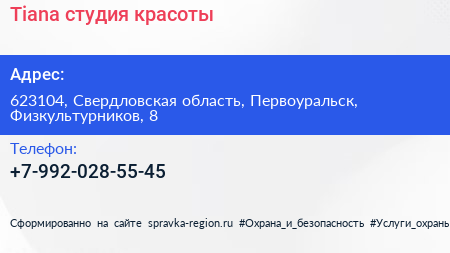 Tiana, студия красоты по адресу 623104, Свердловская область, Первоуральск, Физкультурников, 8 в дальнейшем Организация, размещена в следующих категориях: