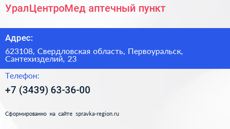 УралЦентроМед, аптечный пункт по адресу 623108, Свердловская область, Первоуральск, Сантехизделий, 23 в дальнейшем Организация, размещена в следующих категориях: