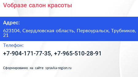 Vобразе, салон красоты по адресу 623104, Свердловская область, Первоуральск, Трубников, 21 в дальнейшем Организация, размещена в следующих категориях: