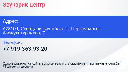 Звукарик, центр по адресу 623104, Свердловская область, Первоуральск, Физкультурников, 7 в дальнейшем Организация, размещена в следующих категориях: