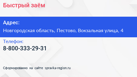 Быстрый заём по адресу Новгородская область, Пестово, Вокзальная улица, 4 в дальнейшем Организация, размещена в следующих категориях: