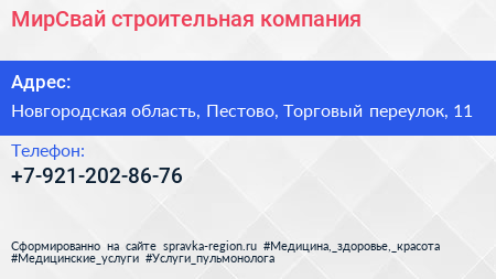 МирСвай, строительная компания по адресу Новгородская область, Пестово, Торговый переулок, 11 в дальнейшем Организация, размещена в следующих категориях: