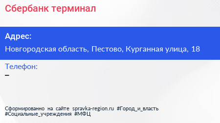 Сбербанк, терминал по адресу Новгородская область, Пестово, Курганная улица, 18 в дальнейшем Организация, размещена в следующих категориях:
