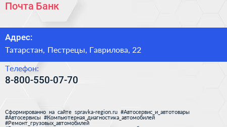 Почта Банк по адресу Татарстан, Пестрецы, Гаврилова, 22 в дальнейшем Организация, размещена в следующих категориях: