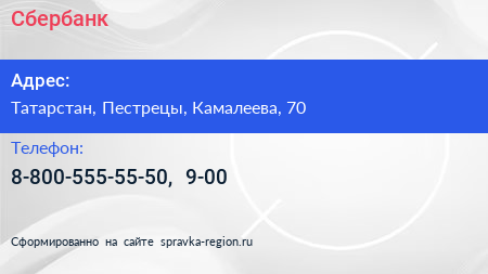 Сбербанк по адресу Татарстан, Пестрецы, Камалеева, 70 в дальнейшем Организация, размещена в следующих категориях: