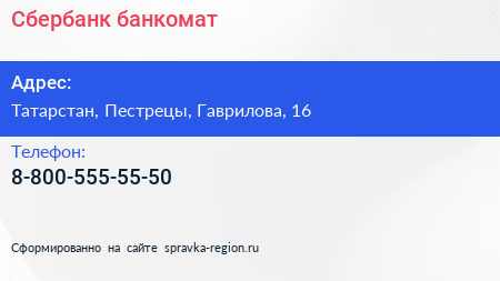 Сбербанк, банкомат по адресу Татарстан, Пестрецы, Гаврилова, 16 в дальнейшем Организация, размещена в следующих категориях: