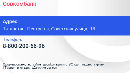 Совкомбанк по адресу Татарстан, Пестрецы, Советская улица, 18 в дальнейшем Организация, размещена в следующих категориях: