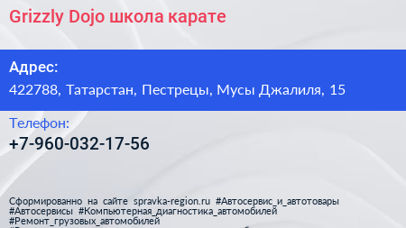 Grizzly Dojo, школа карате по адресу 422788, Татарстан, Пестрецы, Мусы Джалиля, 15 в дальнейшем Организация, размещена в следующих категориях: