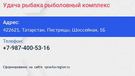 Удача рыбака, рыболовный комплекс по адресу 422621, Татарстан, Пестрецы, Шоссейная, 1Б в дальнейшем Организация, размещена в следующих категориях: