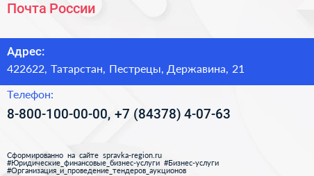 Почта России по адресу 422622, Татарстан, Пестрецы, Державина, 21 в дальнейшем Организация, размещена в следующих категориях:
