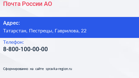 Почта России, АО по адресу Татарстан, Пестрецы, Гаврилова, 22 в дальнейшем Организация, размещена в следующих категориях: