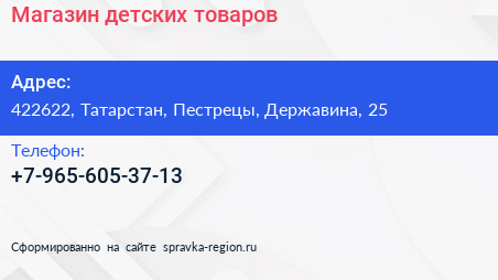 Магазин детских товаров по адресу 422622, Татарстан, Пестрецы, Державина, 25 в дальнейшем Организация, размещена в следующих категориях: