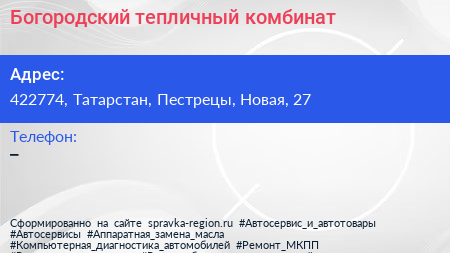 Богородский тепличный комбинат по адресу 422774, Татарстан, Пестрецы, Новая, 27 в дальнейшем Организация, размещена в следующих категориях: