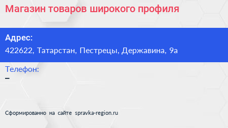 Магазин товаров широкого профиля по адресу 422622, Татарстан, Пестрецы, Державина, 9а в дальнейшем Организация, размещена в следующих категориях:
