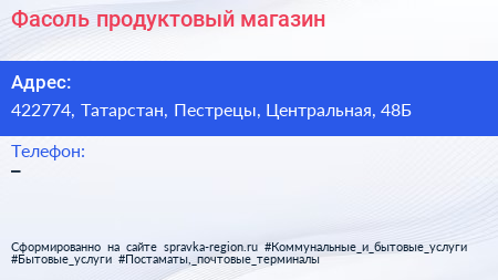 Фасоль, продуктовый магазин по адресу 422774, Татарстан, Пестрецы, Центральная, 48Б в дальнейшем Организация, размещена в следующих категориях:
