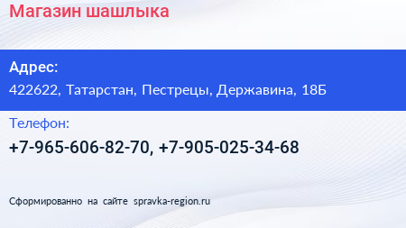 Магазин шашлыка по адресу 422622, Татарстан, Пестрецы, Державина, 18Б в дальнейшем Организация, размещена в следующих категориях: