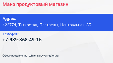 Манэ, продуктовый магазин по адресу 422774, Татарстан, Пестрецы, Центральная, 8Б в дальнейшем Организация, размещена в следующих категориях:
