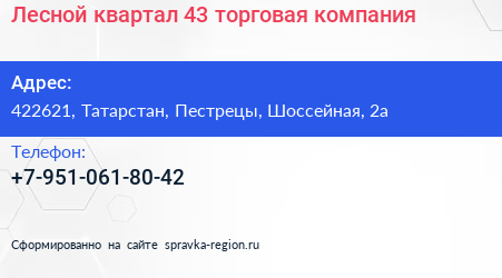 Лесной квартал-43, торговая компания по адресу 422621, Татарстан, Пестрецы, Шоссейная, 2а в дальнейшем Организация, размещена в следующих категориях: