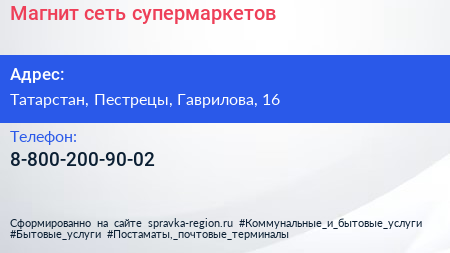 Магнит, сеть супермаркетов по адресу Татарстан, Пестрецы, Гаврилова, 16 в дальнейшем Организация, размещена в следующих категориях: