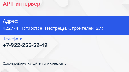 АРТ интерьер по адресу 422774, Татарстан, Пестрецы, Строителей, 27а в дальнейшем Организация, размещена в следующих категориях: