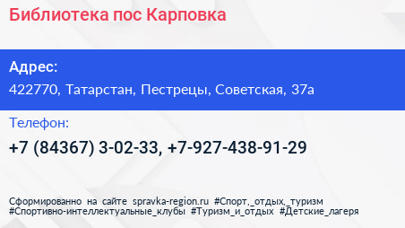 Библиотека, пос. Карповка по адресу 422770, Татарстан, Пестрецы, Советская, 37а в дальнейшем Организация, размещена в следующих категориях: