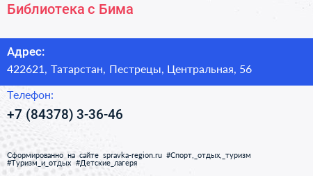 Библиотека, с. Бима по адресу 422621, Татарстан, Пестрецы, Центральная, 56 в дальнейшем Организация, размещена в следующих категориях: