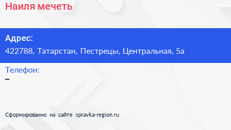 Наиля, мечеть по адресу 422788, Татарстан, Пестрецы, Центральная, 5а в дальнейшем Организация, размещена в следующих категориях:
