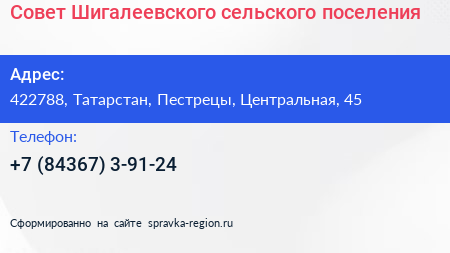 Совет Шигалеевского сельского поселения по адресу 422788, Татарстан, Пестрецы, Центральная, 45 в дальнейшем Организация, размещена в следующих категориях: