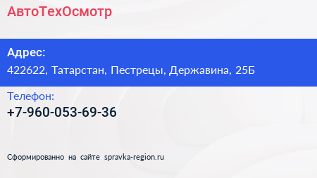 АвтоТехОсмотр по адресу 422622, Татарстан, Пестрецы, Державина, 25Б в дальнейшем Организация, размещена в следующих категориях: