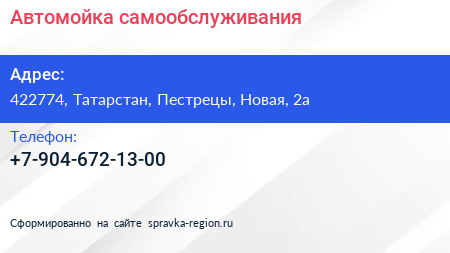 Автомойка самообслуживания по адресу 422774, Татарстан, Пестрецы, Новая, 2а в дальнейшем Организация, размещена в следующих категориях: