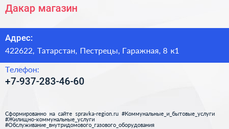 Дакар, магазин по адресу 422622, Татарстан, Пестрецы, Гаражная, 8 к1 в дальнейшем Организация, размещена в следующих категориях: