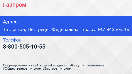Газпром по адресу Татарстан, Пестрецы, Федеральная трасса М7 843 км, 1в в дальнейшем Организация, размещена в следующих категориях: