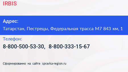 IRBIS по адресу Татарстан, Пестрецы, Федеральная трасса М7 843 км, 1 в дальнейшем Организация, размещена в следующих категориях: