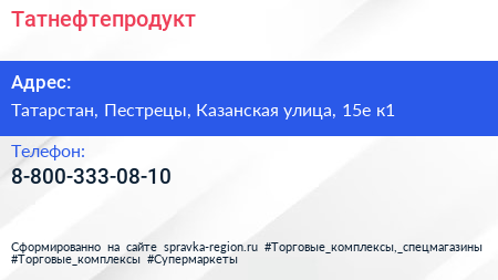 Татнефтепродукт по адресу Татарстан, Пестрецы, Казанская улица, 15е к1 в дальнейшем Организация, размещена в следующих категориях: