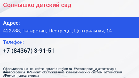 Солнышко, детский сад по адресу 422788, Татарстан, Пестрецы, Центральная, 14 в дальнейшем Организация, размещена в следующих категориях: