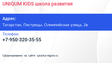 UNIQUM KIDS, школа развития по адресу Татарстан, Пестрецы, Олимпийская улица, 2в в дальнейшем Организация, размещена в следующих категориях: