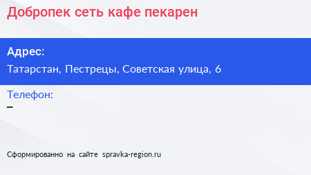 Добропек, сеть кафе-пекарен по адресу Татарстан, Пестрецы, Советская улица, 6 в дальнейшем Организация, размещена в следующих категориях: