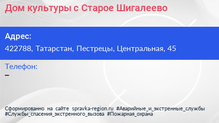Дом культуры, с. Старое Шигалеево по адресу 422788, Татарстан, Пестрецы, Центральная, 45 в дальнейшем Организация, размещена в следующих категориях: