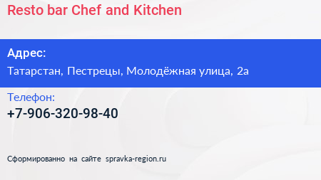Resto bar Chef and Kitchen по адресу Татарстан, Пестрецы, Молодёжная улица, 2а в дальнейшем Организация, размещена в следующих категориях: