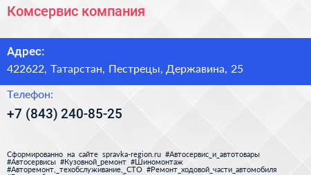 Комсервис, компания по адресу 422622, Татарстан, Пестрецы, Державина, 25 в дальнейшем Организация, размещена в следующих категориях: