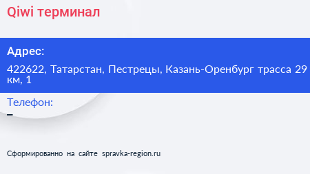 Qiwi, терминал по адресу 422622, Татарстан, Пестрецы, Казань-Оренбург трасса 29 км, 1 в дальнейшем Организация, размещена в следующих категориях:
