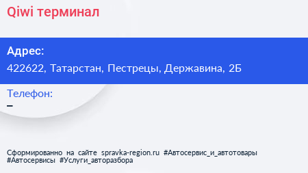 Qiwi, терминал по адресу 422622, Татарстан, Пестрецы, Державина, 2Б в дальнейшем Организация, размещена в следующих категориях: